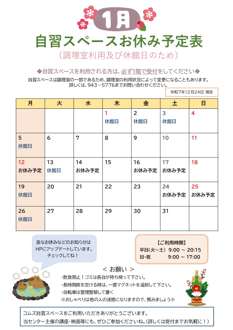自習室お休み予定 1月