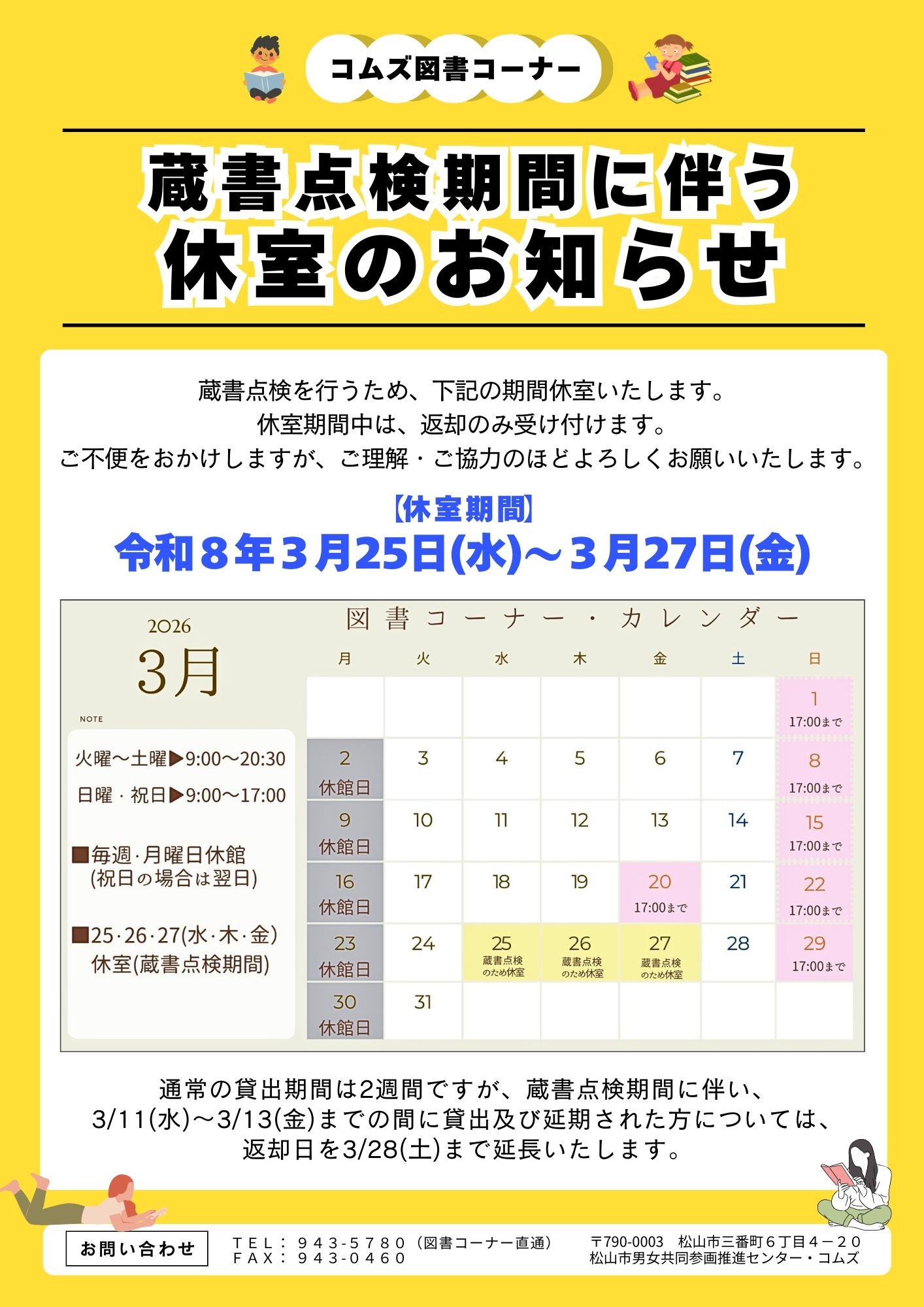 ※通常の貸出期間は2週間ですが、蔵書点検期間に伴い、3/11(水)~3/13(金)までの間に貸出及び延期された方については、返却日を3/28(土)まで延長いたします。